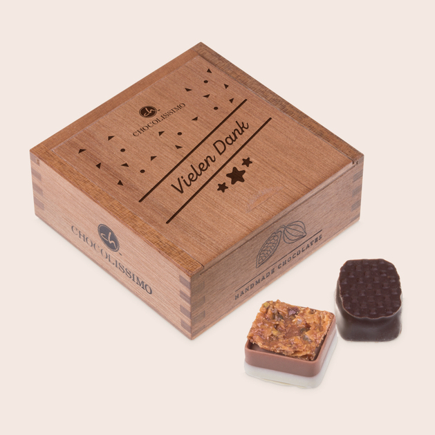Die eingelegten Pralinen sind eine Zufallsauswahl aus unserer Standard-Pralinen-Kollektion. Daher kann es zu Abweichungen zu den Produktbildern und zu Dopplungen der eingelegten Pralinen kommen.