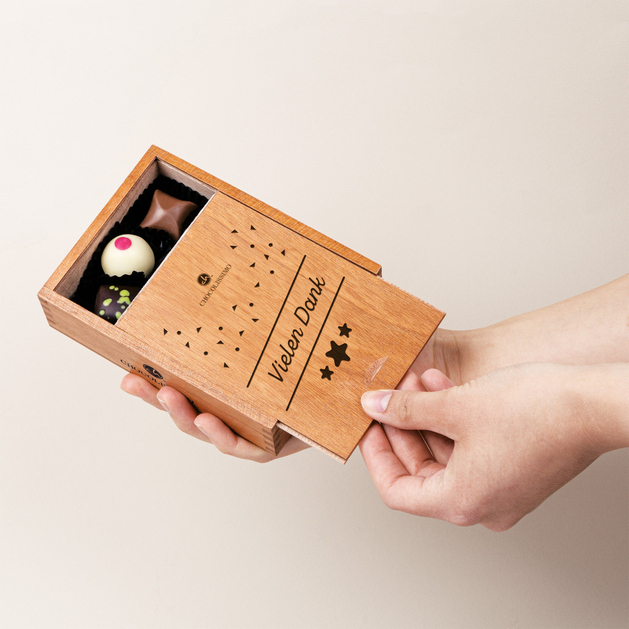 - Ausgewählte Pralinen - In dem Holzkästchen befinden sich 10 exquisite Pralinen aus hochwertiger belgischer Schokolade mit cremigen, zartschmelzenden Füllungen in verschiedenen Geschmacksrichtungen – ein wahres Geschmackserlebnis.