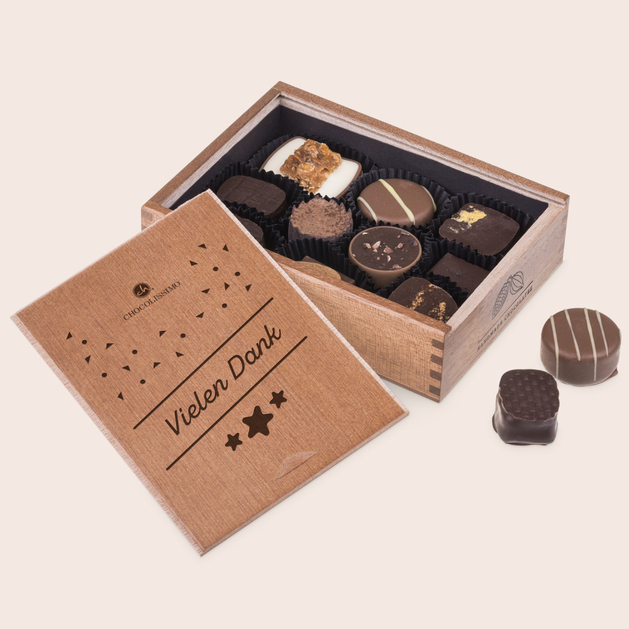 Suchen Sie nach einer einzigartigen Möglichkeit, sich zu bedanken? Unsere Pralinen "Elegance - Vielen Dank“ verbinden feine belgische Schokolade mit eleganter Präsentation. In dem edlen Kästchen aus gabunischem Okoumé-Holz befinden sich zehn sorgfältig ausgewählte Pralinen – hergestellt unter der Aufsicht erfahrener Chocolatiers aus ausgewählten Zutaten und vollendet mit cremigen Füllungen in verschiedenen Geschmacksrichtungen.