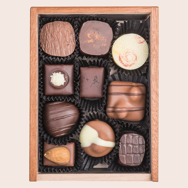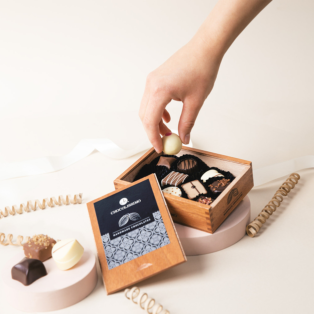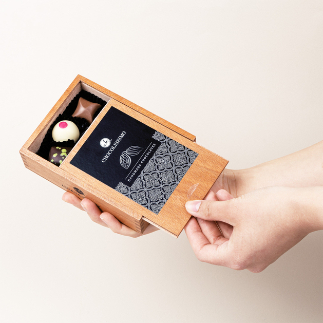 Die Pralinen werden nach Ihrer Bestellung liebevoll in edle Holzschachteln verpackt und mit einem eleganten Siegel versehen