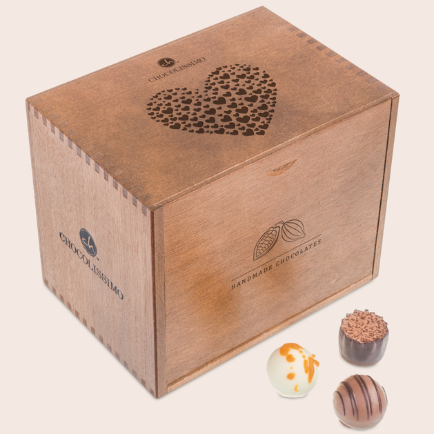 Schenke deiner besseren Hälfte 30 Pralinen zum Valentinstag in einer Holzbox
