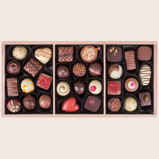 Diese exklusive Holzbox eignet sich perfekt als luxuriöses Pralinengeschenk oder als eleganter Ramadan-Kalender. Sie enthält eine sorgfältig ausgewählte Mischung von 30 handgefertigten Pralinen aus feinster belgischer Schokolade – alle ohne Alkohol.