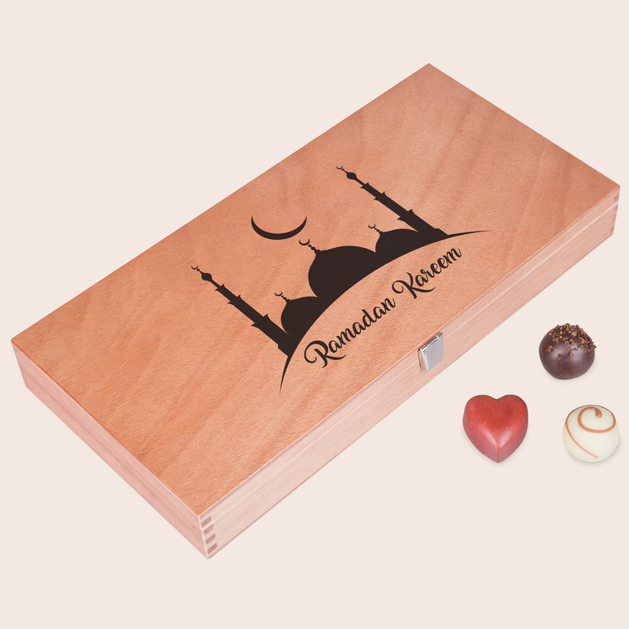 - Dekorative Holzbox mit „Ramadan Kareem“-Gravur – Ein stilvolles und langlebiges Erinnerungsstück, das die Pralinen zu einem luxuriösen Geschenk macht.