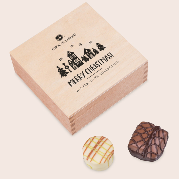 Premiere Quadro Weihnachtspralinen sind perfekt für alle, die höchste Qualität und eine elegante Geschenkverpackung schätzen. Eine klassische, helle Holzschachtel mit festlichem Motiv beherbergt vier handgefertigte Pralinen aus belgischer Schokolade höchster Qualität. Jede Praline ist ein kleines Kunstwerk und ein einzigartiger Genussmoment. Die Möglichkeit, eine persönliche Gravur auf der Schachtelseite anzubringen, macht das Set zu einem persönlichen, unvergesslichen Geschenk.Warum Premiere Quadro Weihnachtspralinen?