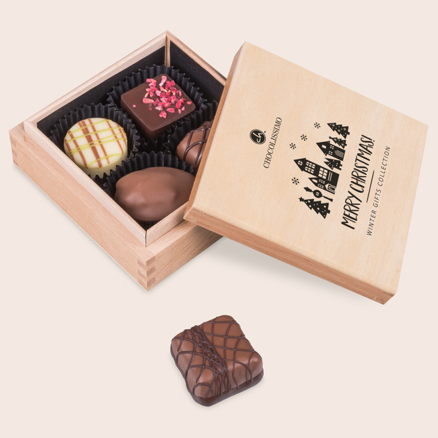 "Xmas Premiere Quadro " vier weihnachtliche Pralinen im Holzkästchen