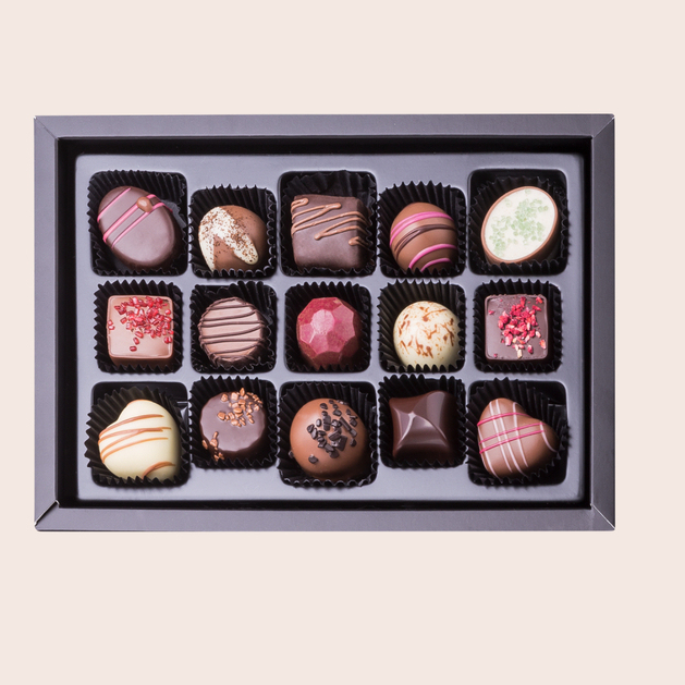 Im Inneren der Verpackung finden sich 15 exzellente Pralinen, die mit feinen Füllungen veredelt sind.