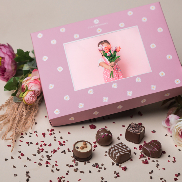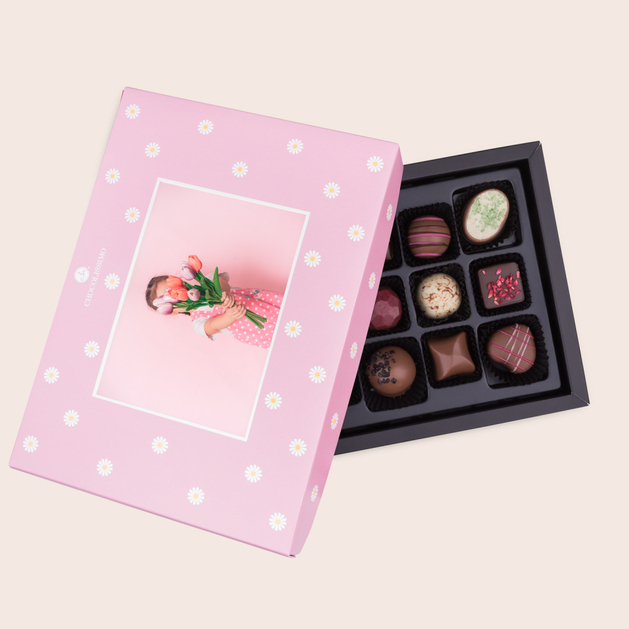 Einfach ein Foto hochladen - wir drucken es aus und arbeiten es in die Verpackung ein! Die Pralinen enthalten teilweise Alkohol.