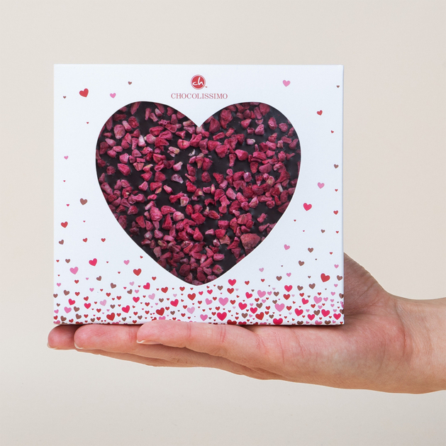 Lassen Sie Ihre Liebsten diese herrliche Zartbitterschokolade genießen, die mit gefriergetrockneten Himbeeren bestreut und in einer romantischen Schachtel in Weiß und Pink verpackt ist.