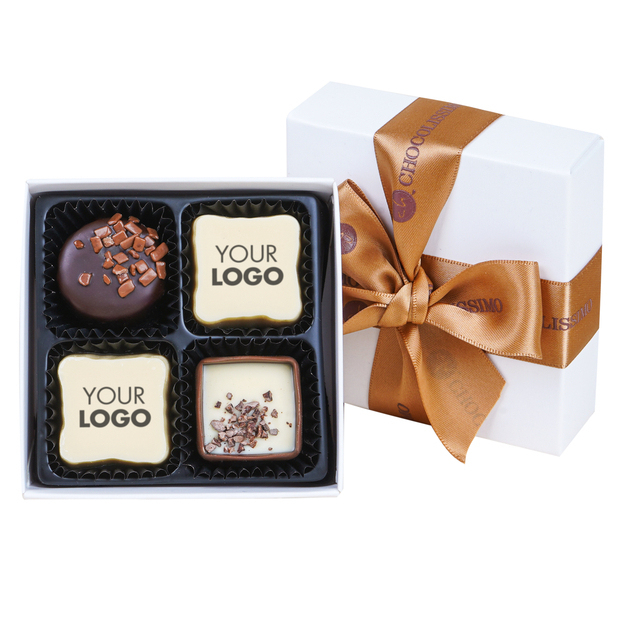 Das White XS Set ist eine exklusive Auswahl von 4 handgefertigten Pralinen aus hochwertiger belgischer Schokolade, die speziell für anspruchsvolle Geschmäcker kreiert wurde. Im Set befinden sich 2 klassische Pralinen und 2 Logo-Pralinen, die mittels direktem Lebensmittelaufdruck individuell mit Ihrem Logo/Wunschmotiv bedruckt werden können. Eine elegante Möglichkeit, Ihre Marke stilvoll zu präsentieren und jeden Beschenkten zu beeindrucken. Die Pralinen enthalten keinen Alkohol.*