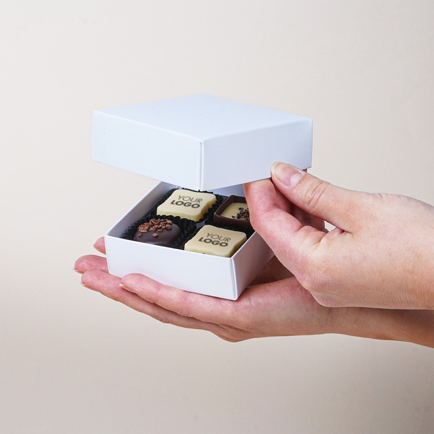 - 2 Logo-Pralinen – Der personalisierte Druck auf der Praline zieht die Aufmerksamkeit auf sich und ermöglicht eine subtile, aber effektive Markenwerbung. Verschiedene Füllungen sind auf Anfrage erhältlich.