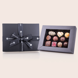 Zwanzig handgefertigte Pralinen mit und ohne Alkohol in einer eleganten und schlichten schwarzen Schachtel. Dekoriert ist die Verpackung mit einer schwarzen chocolissimo-Schleife (siehe Abbildung).
