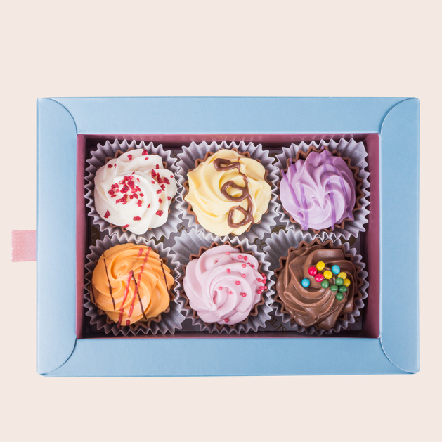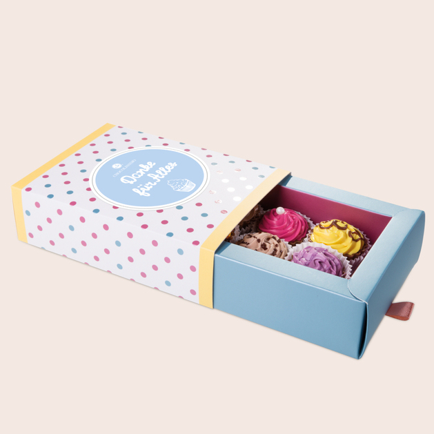Die eingelegten Pralinen sind eine Zufallsauswahl aus unserem Cupcake-Pralinen-Sortiment. Daher kann es zu Abweichungen zu den Produktbildern und zu Dopplungen der eingelegten Pralinen kommen.