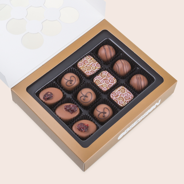 Fans von Vollmilchschokolade werden von dieser Milchinvasion überwältigt. Die Schachtel beinhaltet eine erlesene Auswahl von zwölf handgefertigten Pralinen, mit und ohne Alkohol.