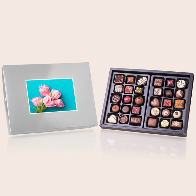Die 'ChocoPostcard Maxi - Silber'  besteht aus 30 exzellente Pralinen, die mit erstklassigen Zutaten und Cremes verfeinert sind.