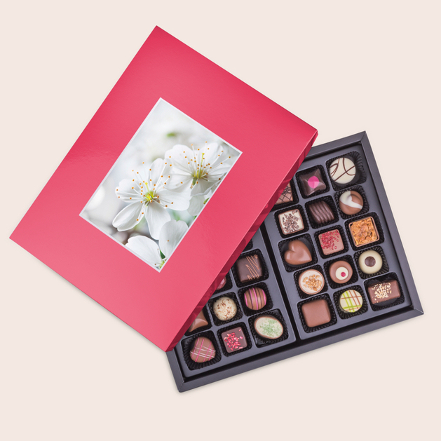 Die 'ChocoPostcard Maxi - Rot' ist sowohl ein optischer als auch ein geschmacklicher Genuss. Allein der rote Deckel sieht bereits sehr edel aus. Er gewinnt darüber hinaus an Exzellenz durch die Möglichkeit, ein eigenes Bild auf ihn drucken zu lassen. Dadurch werden die insgesamt 30 handgefertigten Pralinen, die sich im Inneren der 'ChocoPostcard Maxi - Rot' befinden, zu einem noch hervorragenderen und persönlichen Genuss.