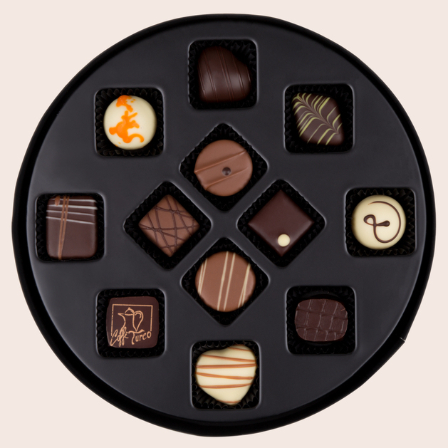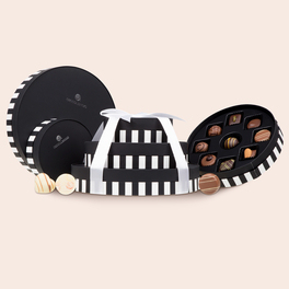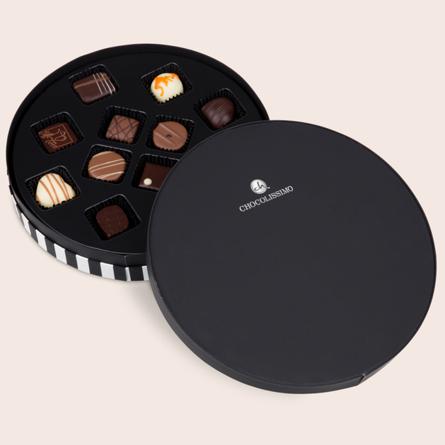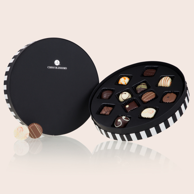Zwölf köstliche handgefertigte Pralinen erwarten Sie beim Öffnen dieser elegant designten Schachtel in den Farben schwarz und weiß.