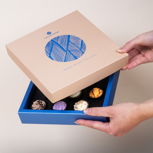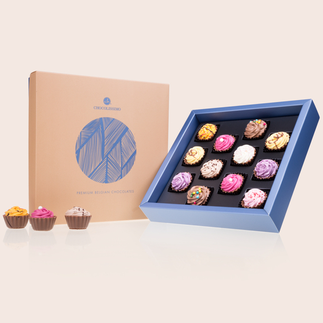 Sie möchten ganz besondere Pralinen verschenken und jemanden gleichzeitig verwöhnen? Dann ist dieses Pralinenset von Chocolissimo genau die richtige Wahl. In der eleganten Schachtel befinden sich zwölf köstliche Pralinen in CupCake -Form, die jeweils herrliche Füllungen besitzen, die zu einem unvergesslichen Geschmackserlebnis führen. Die Verpackung in hellblauen und braunen Farbtönen geben ein Bild der hohen Qualität des Produkts wieder. Auf dem Deckel der Verpackung ist ein schickes Muster zu sehen.