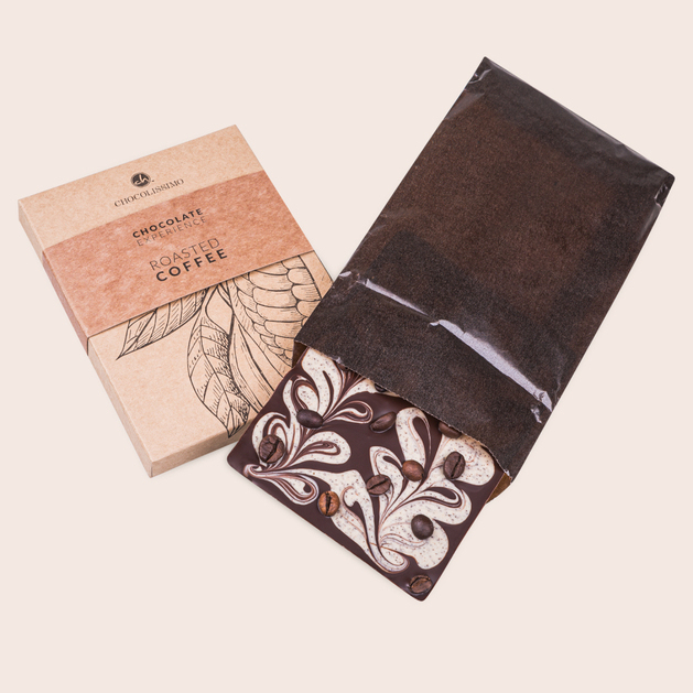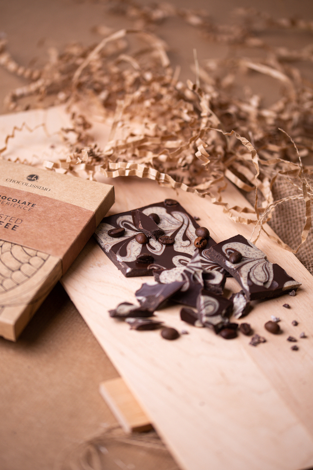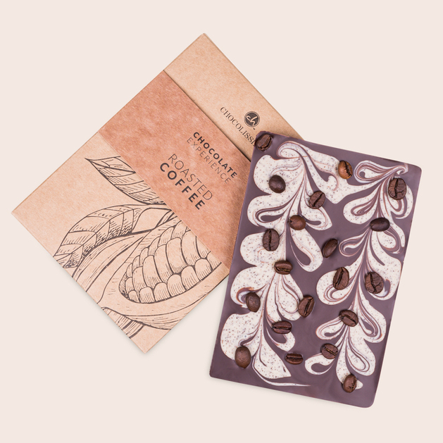 Die Schokolade ist mit Kaffeebohnen bestreut. Wer Kaffee mag, kommt hier voll auf seine Kosten.
