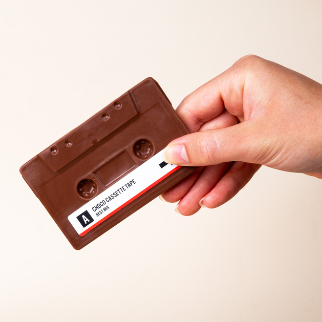 Die handgefertigte Kassette aus belgischer Schokolade ist das ideale Geschenk für Vintage-Liebhaber und Musikfans