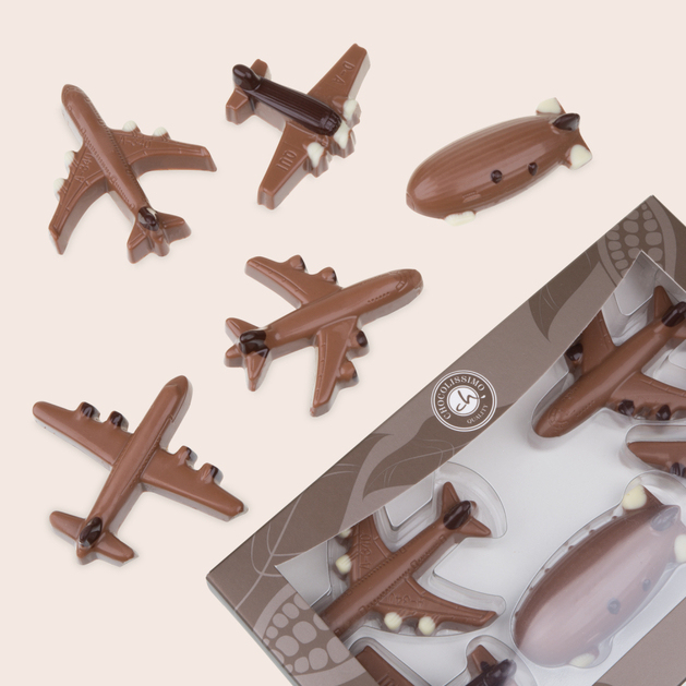 Bei Chocolissimo werden nicht nur exquisite Schokoladentafeln, sondern auch leckere Schokoladenfiguren angeboten. In unserem Sortiment finden Sie u.a. ein Set von schokoladigen Flugzeugen. Viel Liebe zum Detail, leckere Schokolade, tiefer Geschmack – das alles können Sie erwarten, wenn Sie sich für unsere Luftfahrzeuge aus Schokolade entscheiden. In diesem Flugzeug-Set finden Sie detailreiche Schokoladenfiguren aus Vollmilchschokolade mit einem hohen Milchanteil. Die Flugzeuge haben kleine dekorative Elemente aus Zartbitter- oder weißer Schokolade.