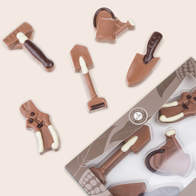 Fünf Schokoladenfiguren geformt zu Gartenwerkzeugen sind eine süße Geschenkidee für alle Hobbygärtner. Mit viel Liebe zum Detail formen unsere Chocolatiers eine Gießkanne, eine Harke, eine Schaufel, einen Spaten und eine Heckenschere aus feinster Vollmilchschokolade und veredeln sie in Aussehen und Geschmack noch durch weiße oder Zartbitterschokolade.