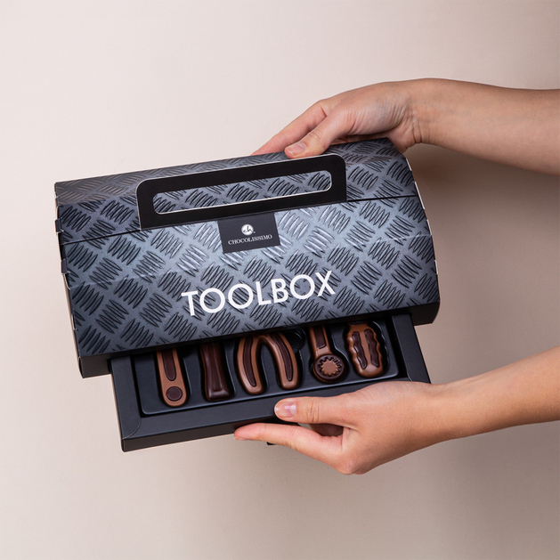 Bist du auf der Suche nach der perfekten Geschenkidee für Männer die das Handwerken lieben? Die schokoladige 'Toolbox I' beinhält fünf Werkzeuge aus köstlicher Vollmilchschokolade mit Dekoration aus Zartbitterschokolade. Um den Look des Werkzeugkastens zu vervollständigen, ist auch die Verpackung ganz dem Stil eines Werkzeugkastens nachempfunden. Das Werkzeug aus Schokolade gehört zu den beliebtesten Geschenken für Männer.