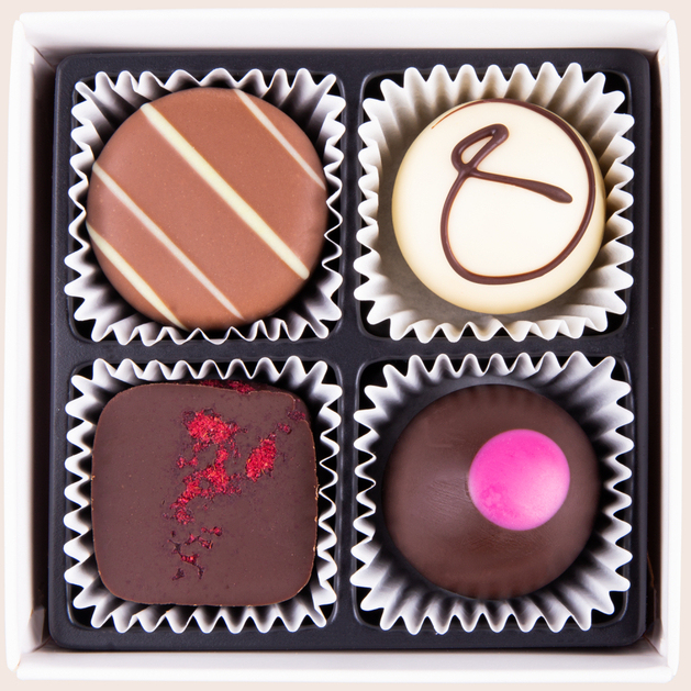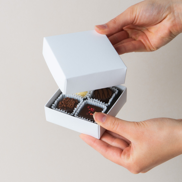 Vier Pralinen in Papierförmchen – Süße Eleganz in einer weißen Schachtel!