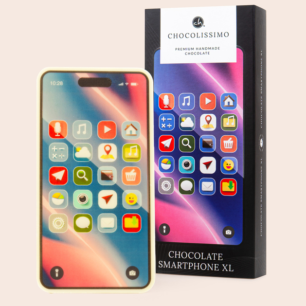 Das Schokoladen-Smartphone ist ein originelles und überraschendes Geschenk, das die Welt moderner Technologie mit höchster Schokoladenkunst verbindet. Dieses Schokoladen-Smartphone wird in der Chocolissimo-Manufaktur vollständig von Hand gefertigt, unter der Aufsicht erfahrener Chocolatiers und ausschließlich aus hochwertiger weißer belgischer Schokolade. Jede Einheit wird direkt vor dem Versand hergestellt, was maximale Frische und hervorragenden Geschmack garantiert.