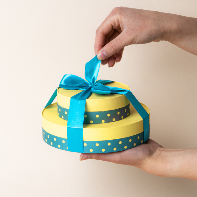 - Elegante Geschenkverpackung – die mehrstöckige Form, das feine Punktmuster und das blaue Band machen die Torte zu einem perfekten Geschenk – ganz ohne zusätzliches Verpacken.