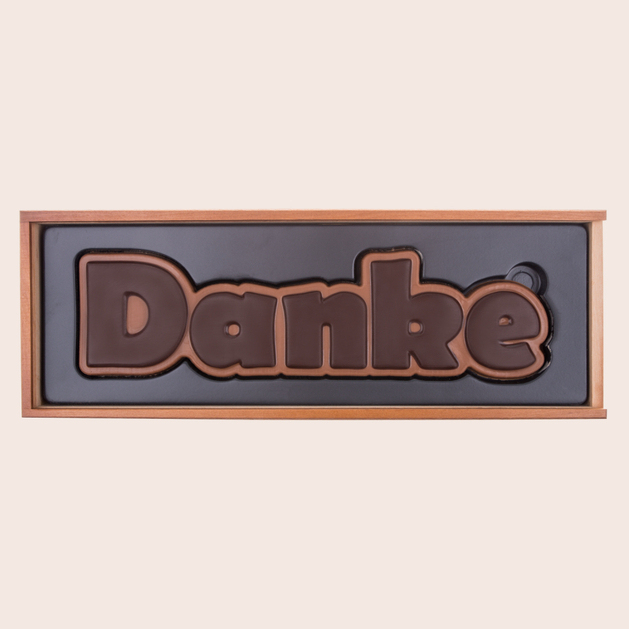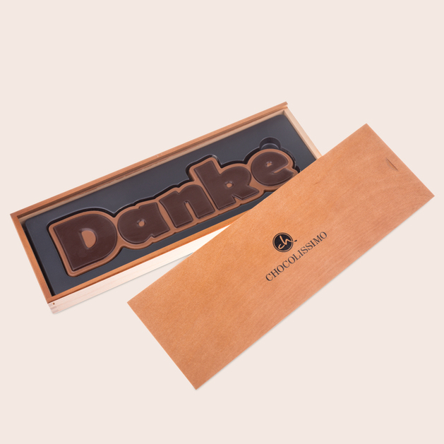 Die Schoko "Danke" sind in einem eleganten Holzkästchen verpackt, die auf Wunsch mit einer persönlichen Gravur versehen werden kann – für ein noch individuelleres und bedeutungsvolleres Präsent.