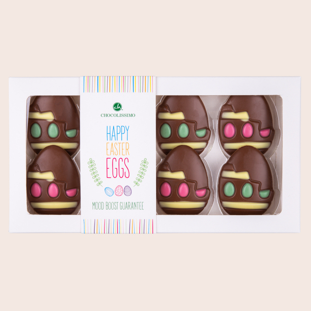 Der Set ist in einer eleganten Schachtel mit Fenster und österlicher Banderole verpackt, was es zu einem perfekten Geschenk für die Feiertage oder als Dekoration für den Ostertisch macht. Die Eier können auch als süße Überraschung für Kinder verwendet werden, indem man sie in den Osterkorb versteckt oder sie in einem festlichen Spiel zur Suche nach Schokoladenspezialitäten einsetzt.