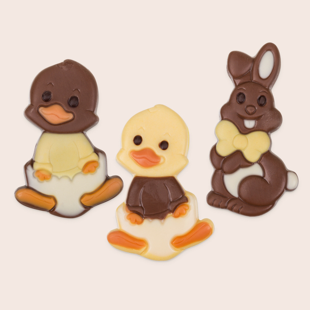 Schokoladenfiguren – zwei Enten und ein Hase – aus hochwertiger, samtiger Vollmilch- und zarter weißer belgischer Schokolade, begeistern sowohl durch ihr Aussehen als auch ihren Geschmack. Jede Figur wurde mit Liebe zum Detail gefertigt und bietet ein unvergessliches Erlebnis für Augen und Gaumen