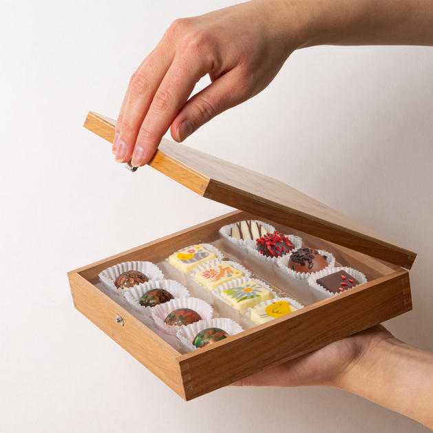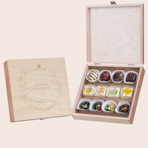 Schenken Sie Ihren Liebsten ein Ostergeschenk, das Vielfalt an Geschmack, handwerkliche Qualität und elegante Präsentation vereint. In dem sorgfältig gefertigten Holzkästchen mit Verschluss befinden sich 12 handgefertigte Pralinen, die in der Chocolissimo-Werkstatt von erfahrenen Chocolatiers direkt vor dem Versand hergestellt werden. Für ihre Herstellung wird ausschließlich hochwertige belgische Schokolade verwendet, die maximale Frische, samtige Konsistenz und ausgezeichneten Geschmack garantiert.