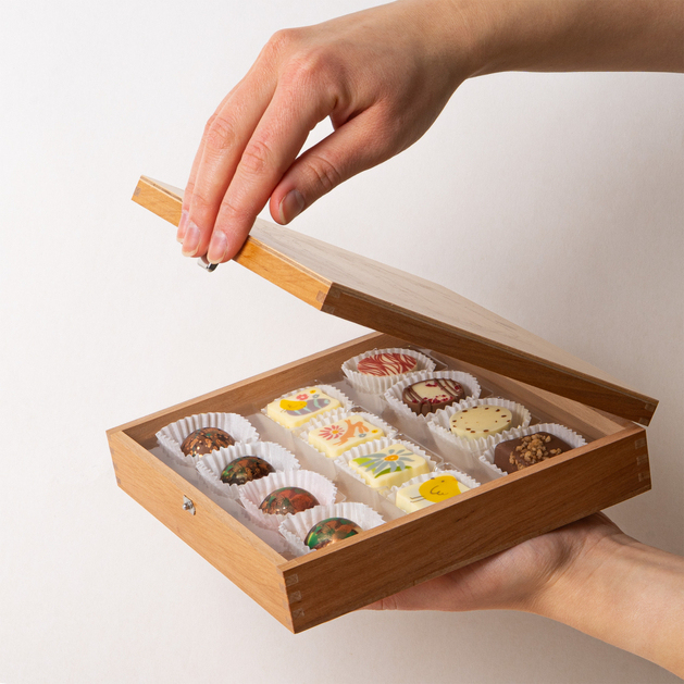 Osterpralinen Kollektion – elegantes Geschenk in einer Holzschatulle