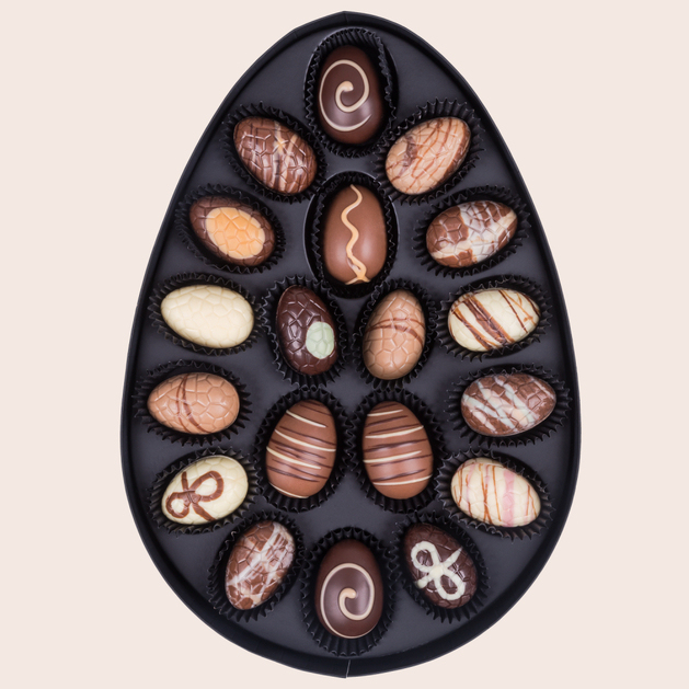 Unter der Aufsicht von Meistern der europäischen Schokoladenkunst kreierte Pralinen in Form von Ostereiern verbergen eine Vielfalt an Füllungen, die aus ausgewählten Zutaten hergestellt werden. Dies ist eine ideale Idee für ein besonderes Geschenk für eine geliebte Person oder eine elegante Dekoration für den Ostertisch aus hochwertiger belgischer Schokolade