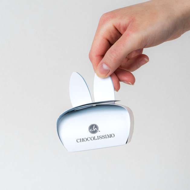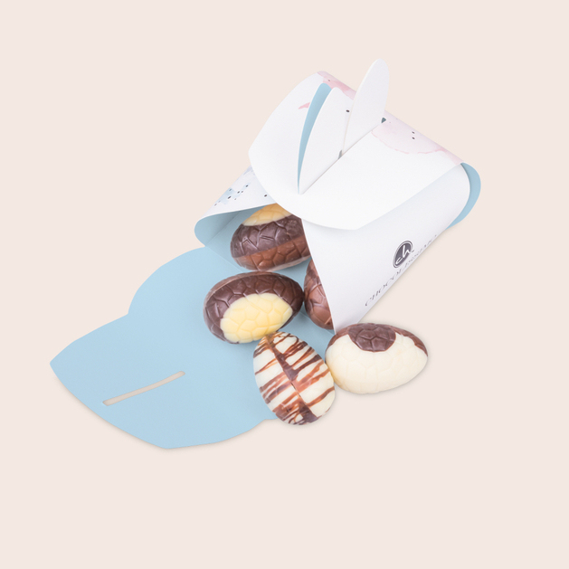 Die künstlerische Verpackung mit Hasenohren verbirgt österliche Pralinen in Form von Ostereiern