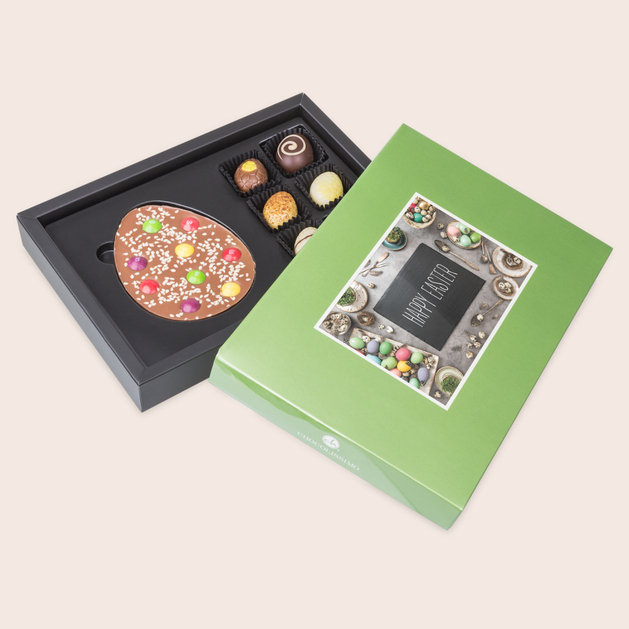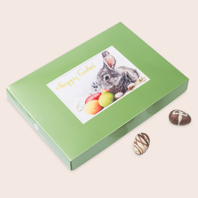 Um diesem Ostergeschenk noch eine persönliche Note zu verleihen, können Sie den Deckel der Schachtel mit einem eigenen Foto versehen lassen. Somit kann der Beschenkte in Erinnerungen schwelgen, während er sich an schokoladigen Leckerbissen erfreut! Einfach ein Foto hochladen - wir bringen es auf die Verpackung!
