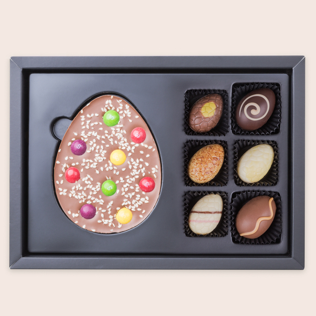 Eine Kombination aus sechs leckeren, gefüllten Ostereiern und einer köstlichen Vollmilchschokoladentafel in Osterei-Form. Diese ist mit Mandelstückchen und bunten Skittles bestreut.