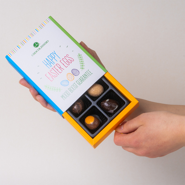 Das Ganze ist in einer dekorativen Box mit österlichem Motiv verpackt, was dieses Set zum perfekten Geschenk für die Feiertage oder zu einer eindrucksvollen Dekoration des Osterfesttisches macht. Zudem werden die Pralinen von Hand kurz vor dem Versand verpackt, was ihre maximale Frische und ihren einzigartigen Geschmack gewährleistet.