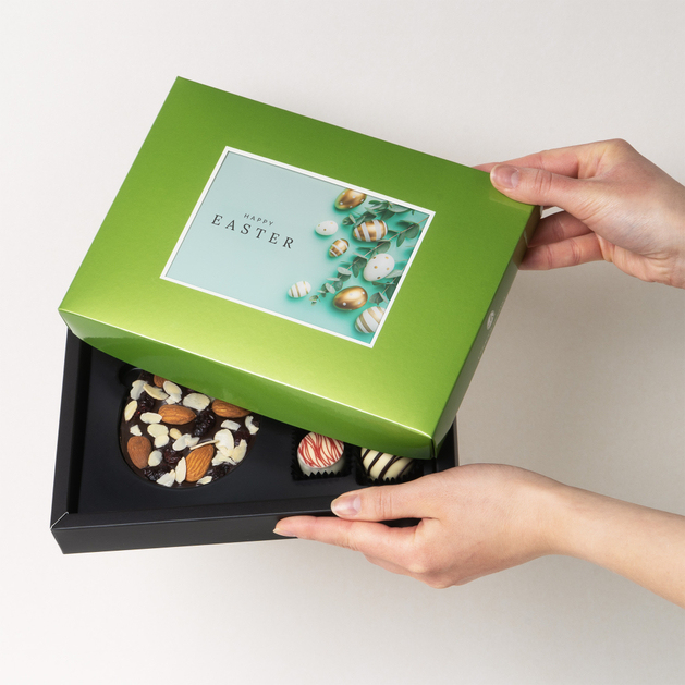 Das Set ist in einer eleganten Schachtel mit österlichem Motiv verpackt, und Sie können die Verpackung zusätzlich personalisieren, indem Sie ein Foto und eine Botschaft auswählen, die wir darauf platzieren. Eine solche personalisierte ChocoPostkarte macht Ihr Geschenk noch einzigartiger und persönlicher!