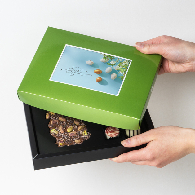 Hergestellt aus hochwertiger belgischer Schokolade und kreiert von erfahrenen europäischen Chocolatiers, garantiert jedes Element des Sets höchsten Genuss. Die Köstlichkeiten sind in einer zarten, hellgrünen Verpackung arrangiert, die Sie mit einem individuellen Foto oder einer Grafik personalisieren können. So entsteht ein einzigartiges Geschenk, das Ostern noch besonderer macht.