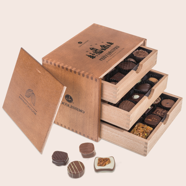 Das exklusive, weihnachtliche Holzkästchen mit drei Schubladen beinhaltet eine erlesene Auswahl von 30 Pralinen mit Alkohol und Pralinen ohne Alkohol.