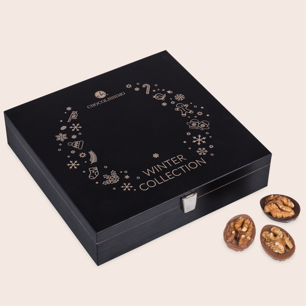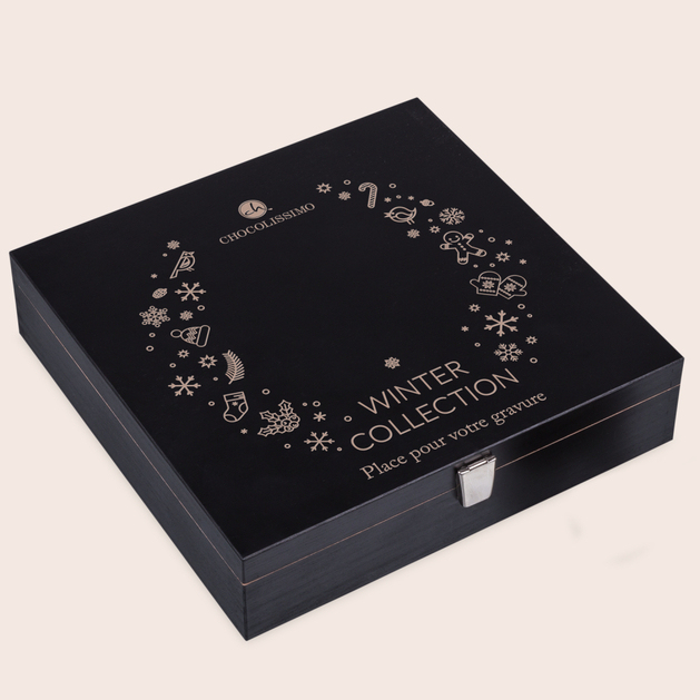Das Weihnachts-Haselnuss-Pralinen-Set vereint den exquisiten Geschmack hochwertiger belgischer Schokolade mit einem Hauch von Nuss und einer eleganten Präsentation. Eine schwarze Holzschachtel mit Weihnachtsmotiv enthält handgefertigte Chocolissimo-Pralinen aus hochwertiger belgischer Schokolade und sorgfältig ausgewählten Zutaten. Jedes Detail – von der nussigen Füllung bis zur weihnachtlichen Dekoration – macht dieses Set zu einem unvergesslichen Geschenk. Die Möglichkeit, den Deckel mit einer eigenen Gravur zu versehen, verleiht ihm eine persönliche und einzigartige Note.