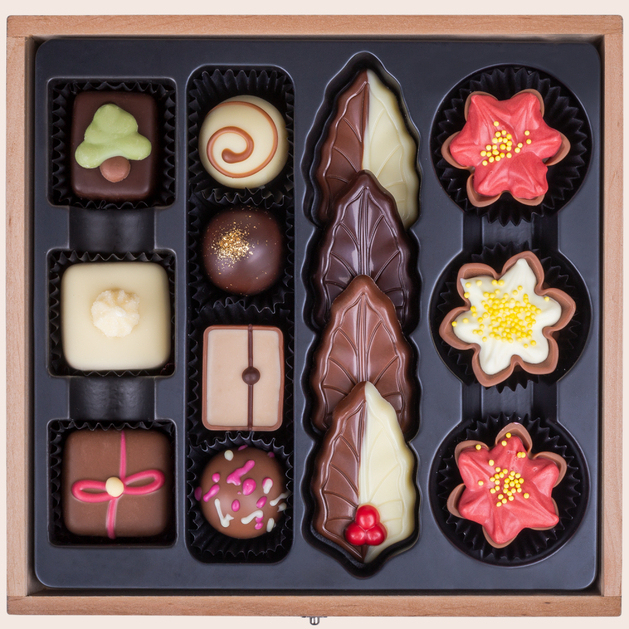 Ein edles, schwarzes Holzkästchen mit einzigartigen Pralinen und Schokoladentafeln. Pralinen, Weihnachtsstern-Pralinen, blattförmige Schokolade und Pralinen mit weihnachtlichen Motiven treffen aufeinander! Pralinen enthalten teilweise Alkohol.