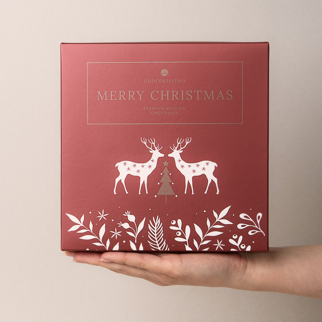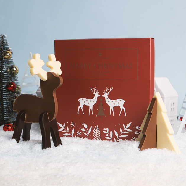 Der Schokoladen-Weihnachtsbaum und das Rentier werden in unserem Chocolissimo-Studio aus belgischer Schokolade höchster Qualität handgefertigt – samtiger Milchschokolade, leuchtender dunkler Schokolade und zarter weißer Schokolade. Die Kombination dieser drei Schokoladensorten schafft eine harmonische Geschmackskomposition und hebt jedes Detail der Figur subtil hervor.