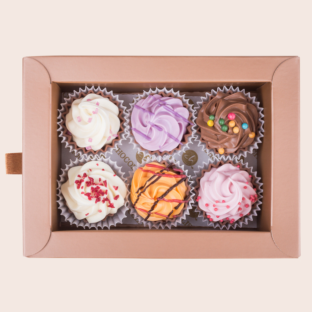 6 bunte Cupcake-Pralinen in einer edlen weiß-goldenen Schachtel