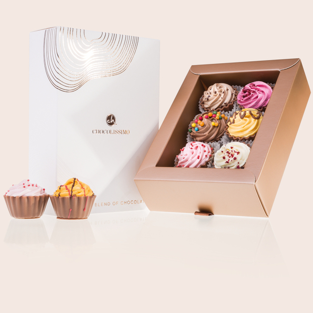 Die Pralinen in Form von niedlichen amerikanischen Cupcakes vereinen Süße mit kreativer Gestaltung. Jede Praline besticht durch ihre realistische Cupcake-Form, die an das berühmte Dessert erinnert. Die elegante Schachtel, entworfen von unseren talentierten Designern, verleiht dem Geschenk einen edlen Charakter und macht es zu einer perfekten Überraschung
