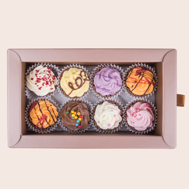 8 Cupcakes Pralinen in einer edlen weiß-goldenen Schachtel