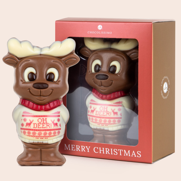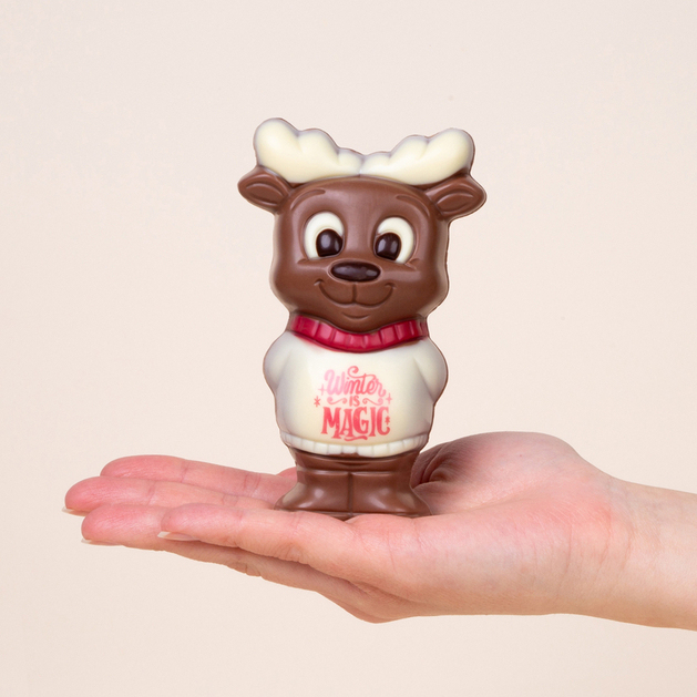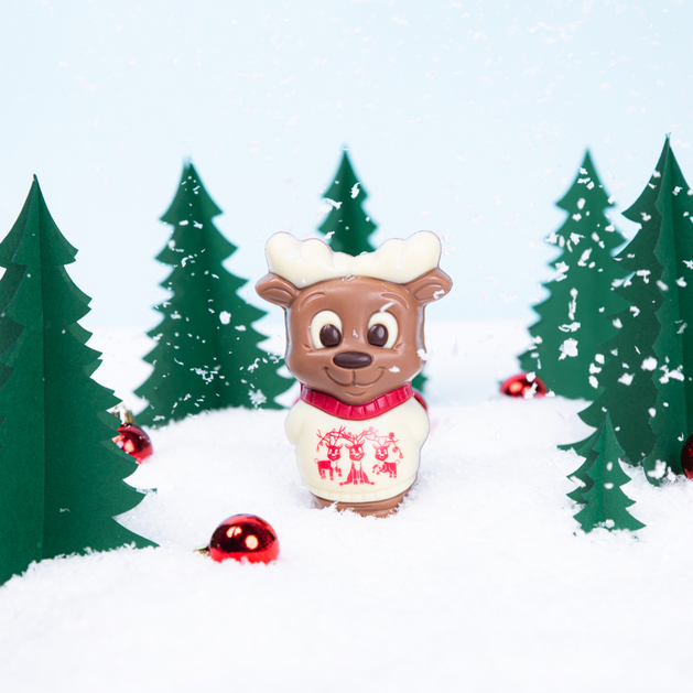 Schokoladen-Rentier im weißen Pullover – Santas charmanter Helfer
