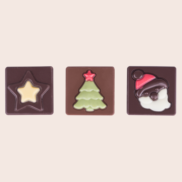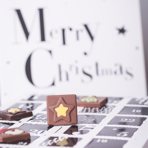 - 24 Schokoladentäfelchen (12 aus Vollmilch- und 12 aus Zartbitterschokolade) beinhalten weihnachtliche Motive aus gefärbter Schokolade.